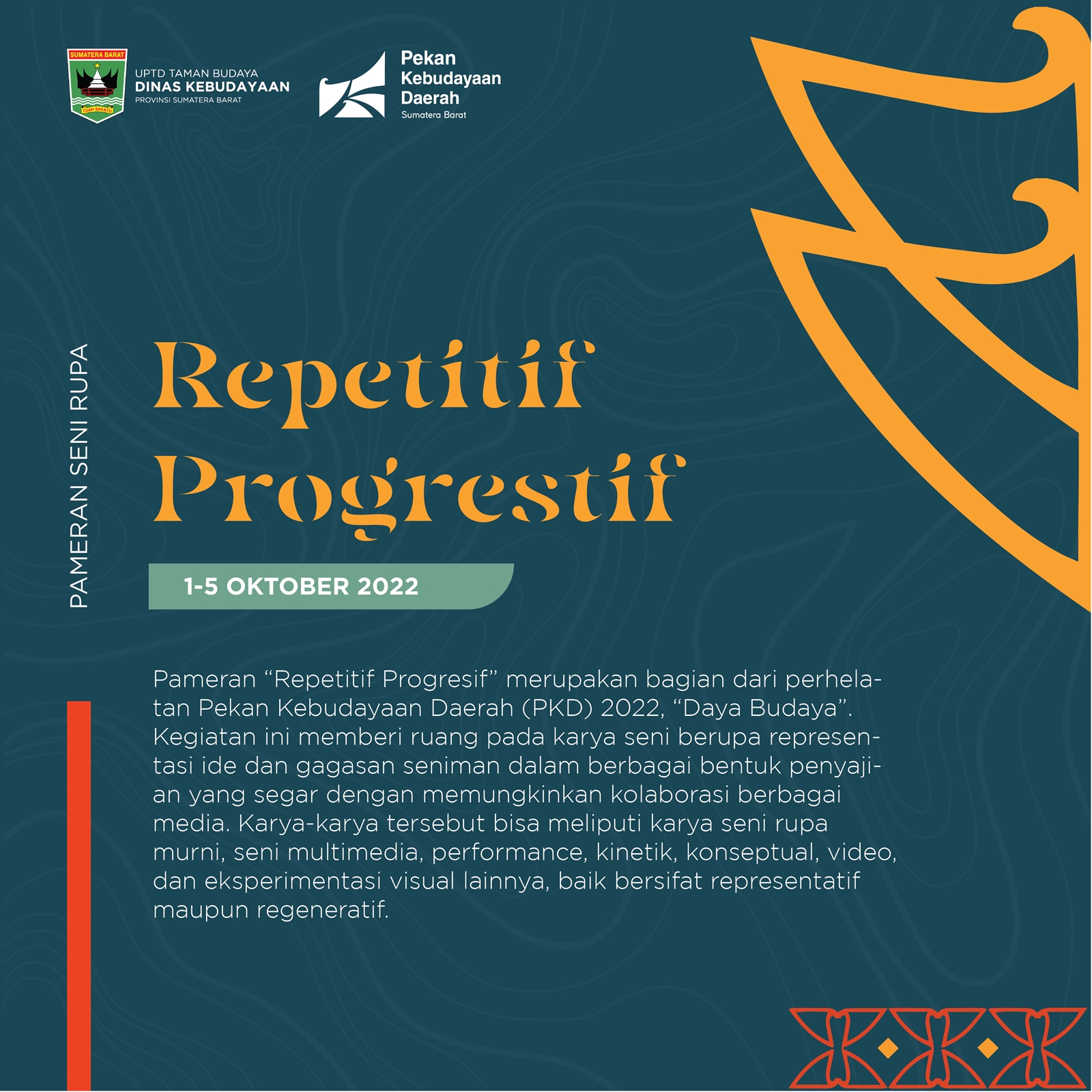 Pameran “Repetitif Progresif” merupakan bagian dari perhelatan Pekan Kebudayaan Daerah (PKD) 2022, “Daya Budaya”. Kegiatan ini memberi ruang pada karya seni berupa representasi ide dan gagasan seniman dalam berbagai bentuk penyajian yang segar dengan memungkinkan kolaborasi berbagai media. Karya-karya tersebut bisa meliputi karya seni rupa murni, seni multimedia, performance, kinetik, konseptual, video, dan eksperimentasi visual lainnya, baik bersifat representatif maupun regeneratif.